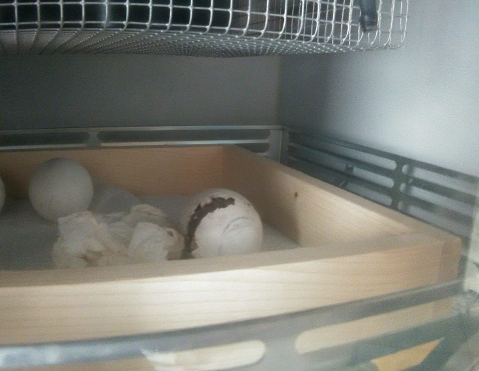 Es kündigte sich gestern bereits an, Romy lag viel, es wurde sehr viel ausgepolstert und aufgelockert. Von der Befruchtung bis zur Eiablage dauert es 2 Tage. Bebrütet werden die Eier spätestens mit dem 2. Ei, manchmal auch sofort. Die Brutzeit beträgt 30 bis 32 Tage. Die Eier werden einige male am Tag gewendet, das ist notwendig damit der Embryo nicht mit der Eihaut verklebt. Das Ei wiegt bis zwischen 85 und 110g.