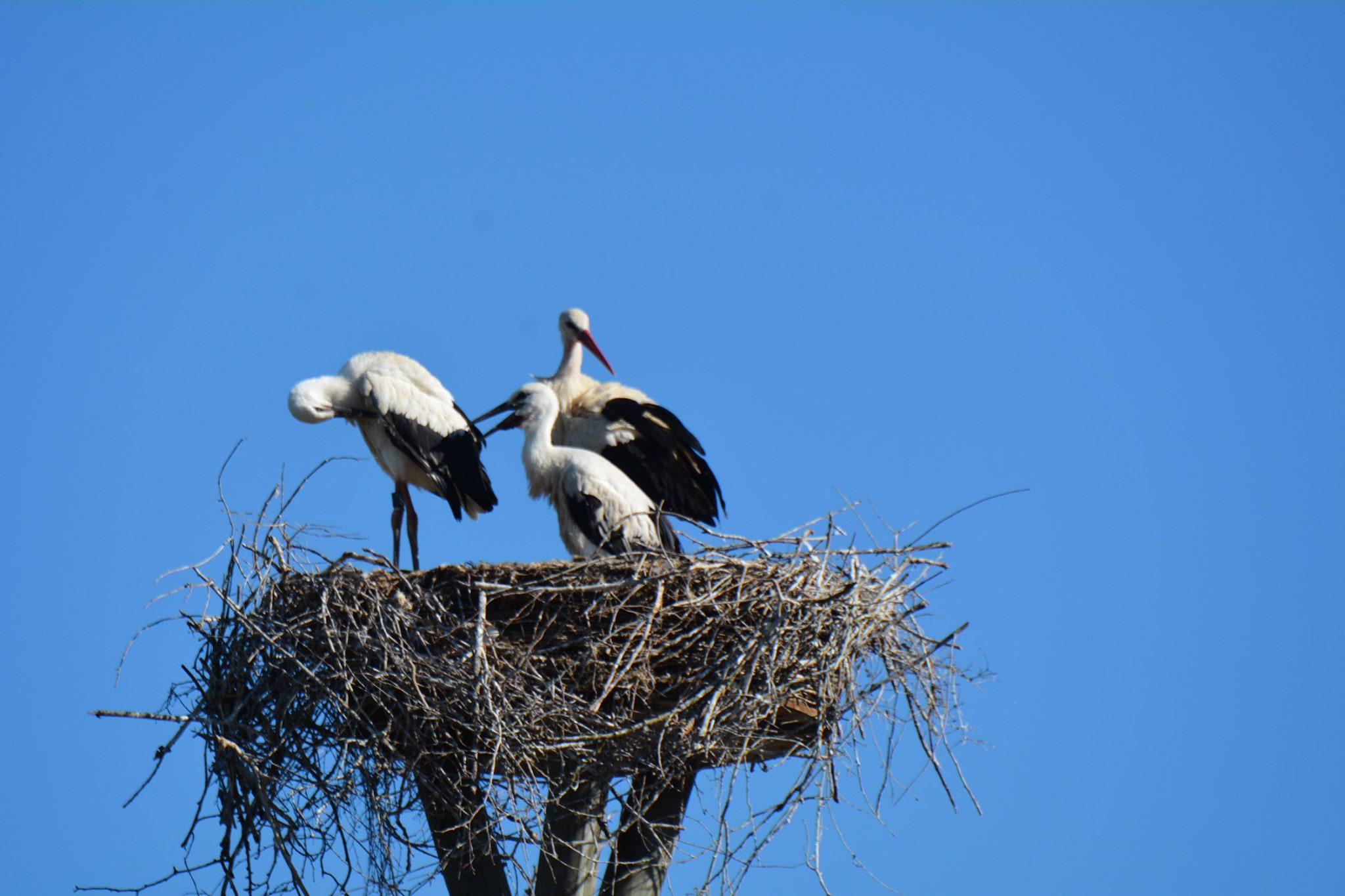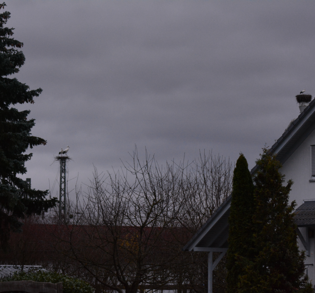 Weitere Altstörche sind abgezogen, bzw. der Horst ist leer. Es ist durchaus möglich, dass sie sich noch in der näheren Umgebung aufhalten.