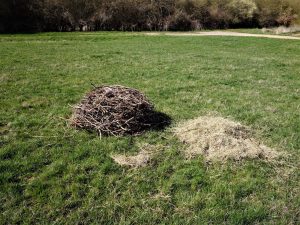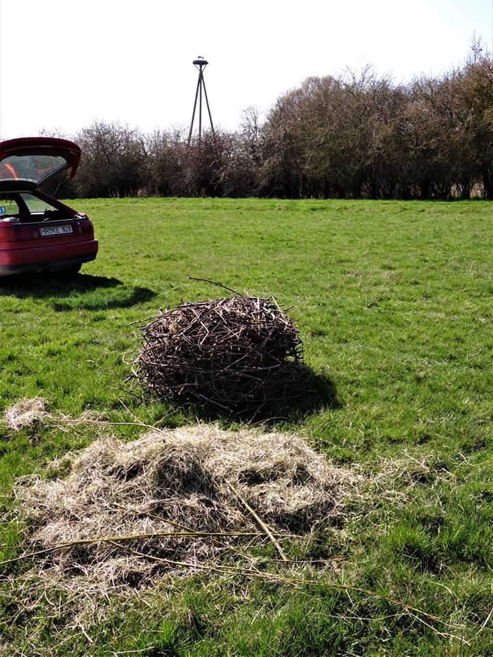 So – nicht nur die Störche vom Bahnmast sind wieder umgezogen, sondern auch gleich das ganze Nest. Dank dem zeitnahen und engagierten Einsatz des Teams der Deutschen Bahn (DB-Netz) wurde das bestehende Nistmaterial vom Mast entfernt, und bereits am Abend zogen es die ‚Unshäuser‘ wohl vor, sich doch wieder auf ihrem angestammten Horst einzurichten. Daher wurde auch zur Verschönerung des Heims heute das ganze verbaute Material incl. etwas Kuschelheu auf die Wiese ganz in der Nähe des Horstes verbracht. Da dürfen sich die beiden gerne bedienen… (Natürlich sind der Eigentümer der Wiese sowie der Bewirtschafter informiert) Bereits gestern Abend gg. 19:20Uhr saß ein Storch im Horst.