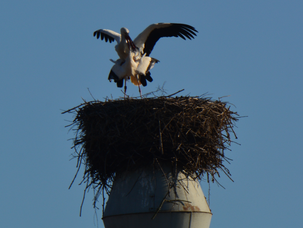 Störche kämpfen um ihren Horst, sie sind in erster Linie dem Horst treu, nicht dem Partner. Der männliche Storch beruhigte sich recht schnell, ein Weibchen ist da, was will er mehr!