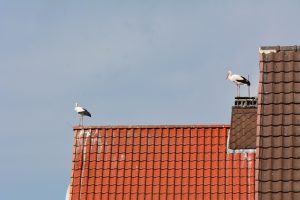 Ein weiblicher Storch sitzt noch etwas unsicher auf dem Dach in der Nähe des Horstes. Ein Paar hat sich auf der Kirche nieder gelassen. Das Geläut hat sie allerdings am Abend verschreckt.