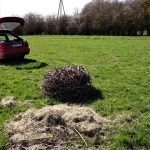 So – nicht nur die Störche vom Bahnmast sind wieder umgezogen, sondern auch gleich das ganze Nest. Dank dem zeitnahen und engagierten Einsatz des Teams der Deutschen Bahn (DB-Netz) wurde das bestehende Nistmaterial vom Mast entfernt, und bereits am Abend zogen es die ‚Unshäuser‘ wohl vor, sich doch wieder auf ihrem angestammten Horst einzurichten. Daher wurde auch zur Verschönerung des Heims heute das ganze verbaute Material incl. etwas Kuschelheu auf die Wiese ganz in der Nähe des Horstes verbracht. Da dürfen sich die beiden gerne bedienen… (Natürlich sind der Eigentümer der Wiese sowie der Bewirtschafter informiert) Bereits gestern Abend gg. 19:20Uhr saß ein Storch im Horst.