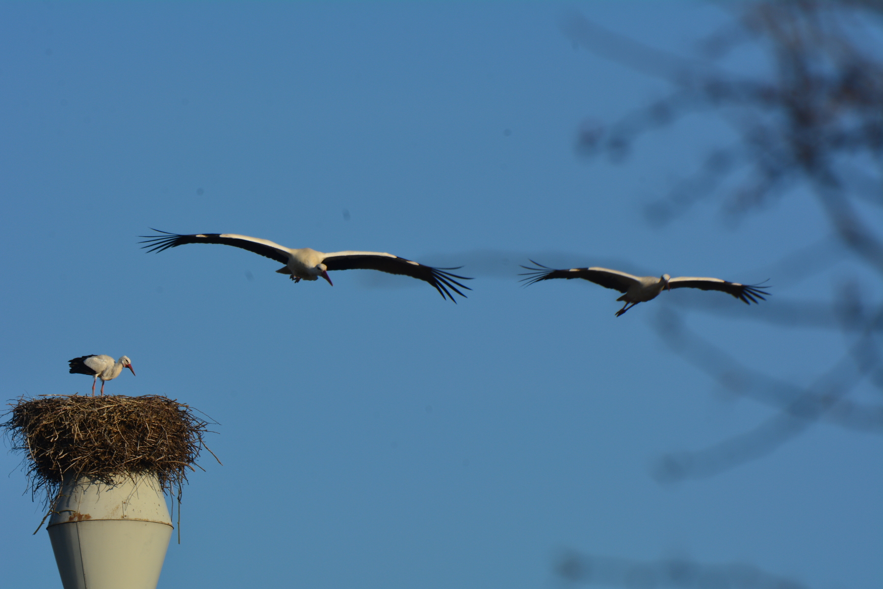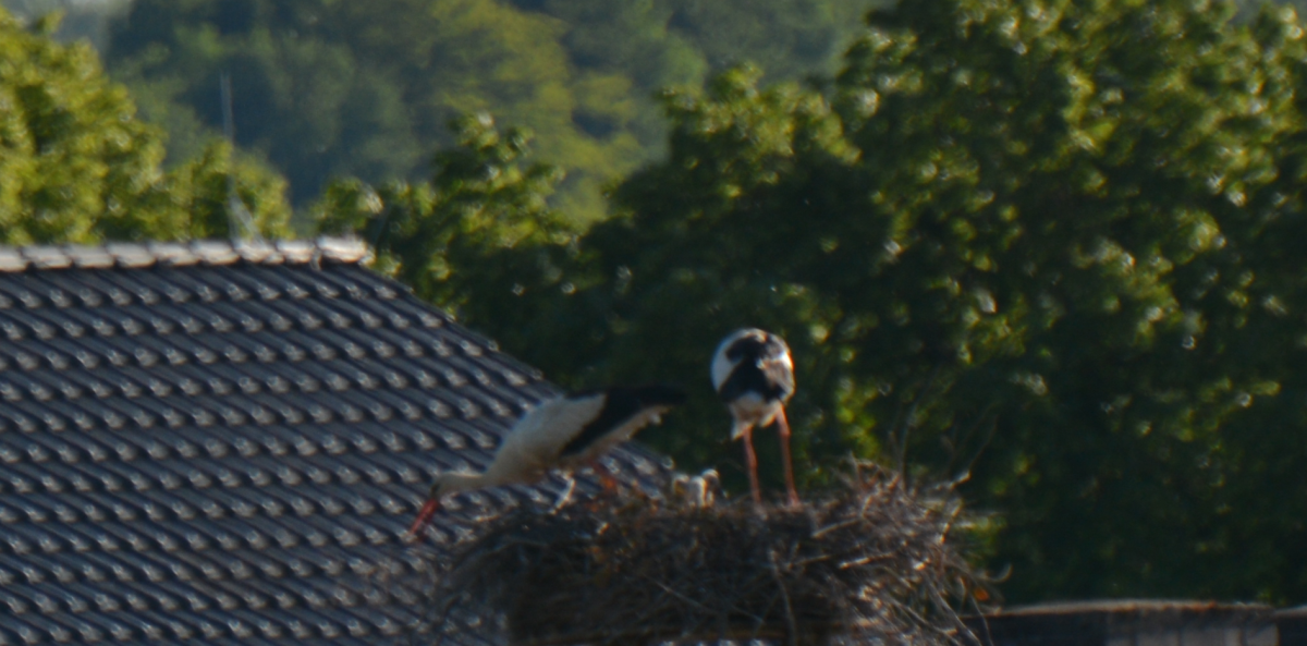 Weitere Altstörche sind abgezogen, bzw. der Horst ist leer. Es ist durchaus möglich, dass sie sich noch in der näheren Umgebung aufhalten.