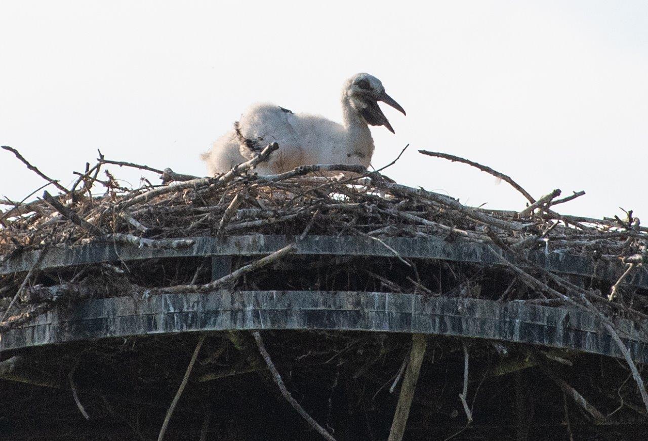 Am Freitagnachmittag wurde festgestellt, dass der letzte, knapp 3 Wochen alte Jungstorch über viele Stunden alleine im Horst saß.