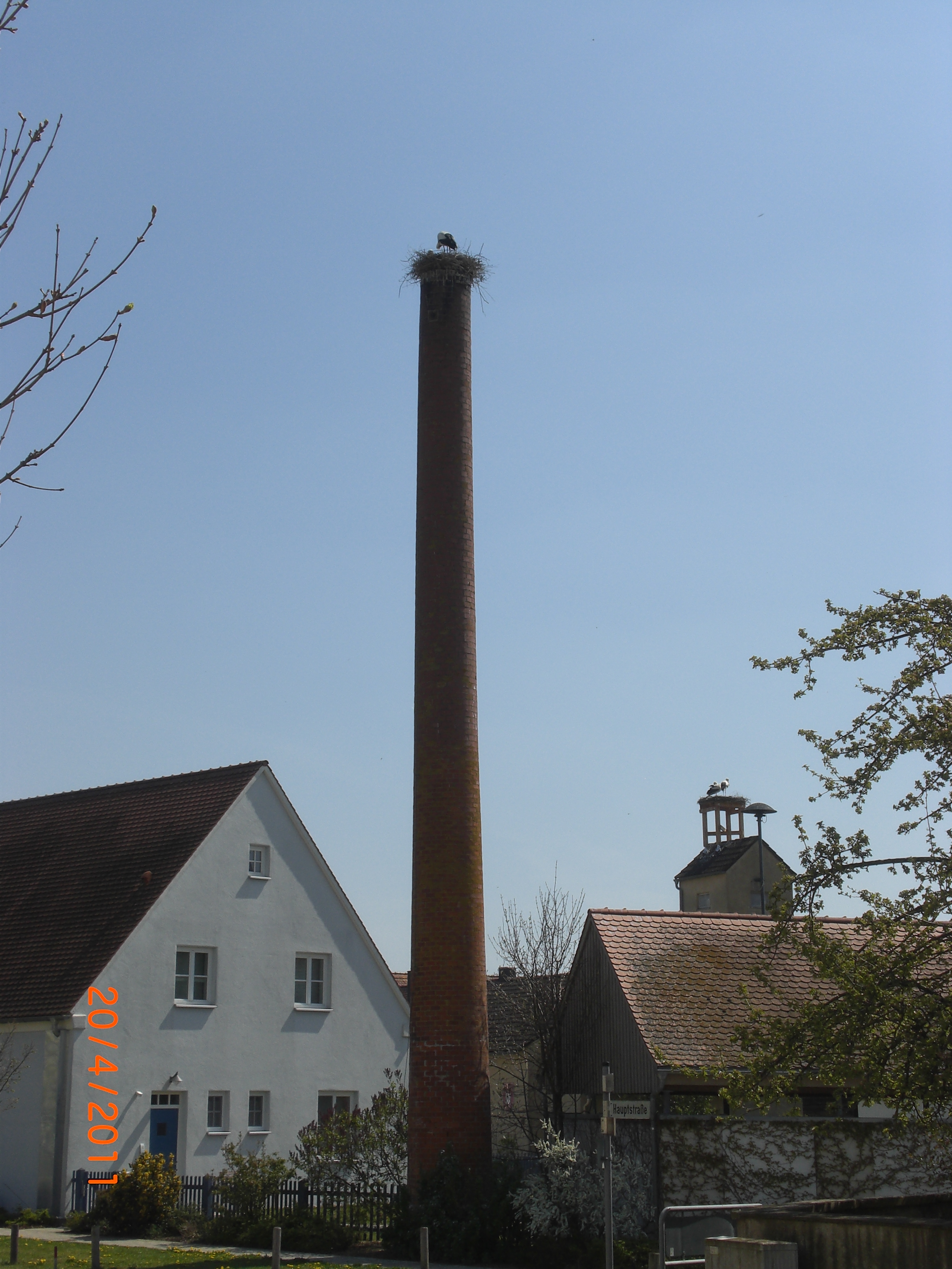 Ursprünglich sollte der Schlot der ehemaligen Molkerei abgerissen werden. Die Anwohner konnten sich durchsetzen, er wurde saniert und der Storchenhorst konnte erhalten bleiben.