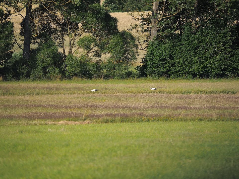 Bereits zwei Jahre nach der Aufstellung wird der Horst von zwei Störchen bewohnt, gebrütet wird aber nicht. Gute Voraussetzungen für die kommenden Jahre. An Nahrung sollte es ihnen dort nicht mangeln.