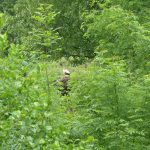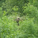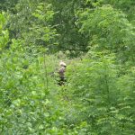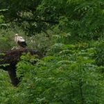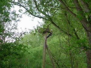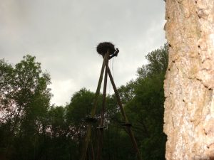 Die toten Küken sollten geborgen und untersucht werden, der schwer erreichbare Horst stellte uns vor fast unlösbare Probleme. Das Gelände ist nur mit einem Kettenfahrzeug und nur in Vorarbeit befahrbar. Seit dem 08.05. vermuteten wir den Totalausfall im Horst, bereits 2 Tage vorher gab es Auffälligkeiten. Unsere letzte Hoffnung etwas zu klären oder auch handeln zu können war der Baumläufer, der mittags angerufen schon am frühen Abend vor Ort war. Georges und Julie haben bereits begonnen neu zu bauen, dass ergab sich aus der Besteigung durch den Baumläufer. Die toten Küken liegen entweder unter dem Neubau oder sie wurden herausgeworfen und von Fuchs oder Waschbär gefunden. Weitere sehr aufwendige Massnahmen zur Sanierung des Horstes erfolgen nach der Brutsaison. Wir können nur hoffen, dass bei einem Nachgelege nicht wieder die gleichen Probleme zu einem Verlust führen. Der Grünstreifen im unmittelbaren Bereich des Horstes wurde zu verbotener Zeit mit Pestiziden behandelt, eine Anzeige bei der Naturschutzbehörde erfolgte.