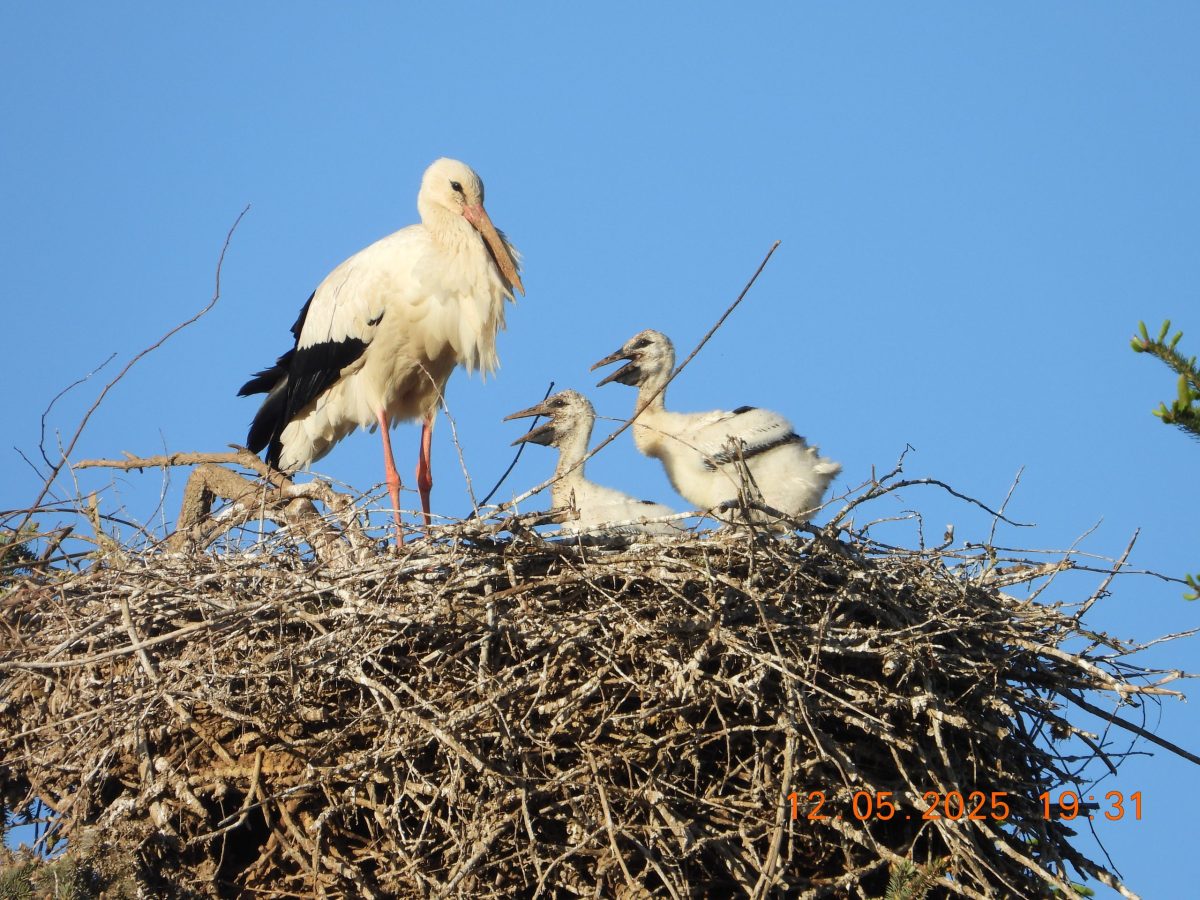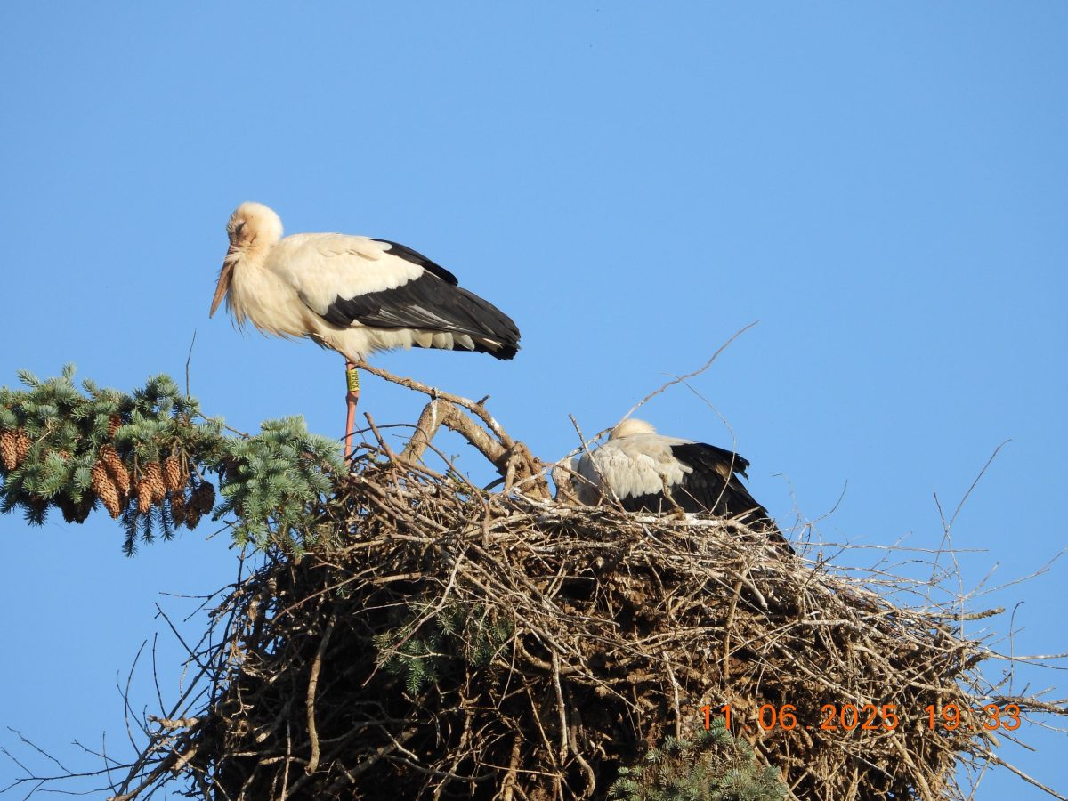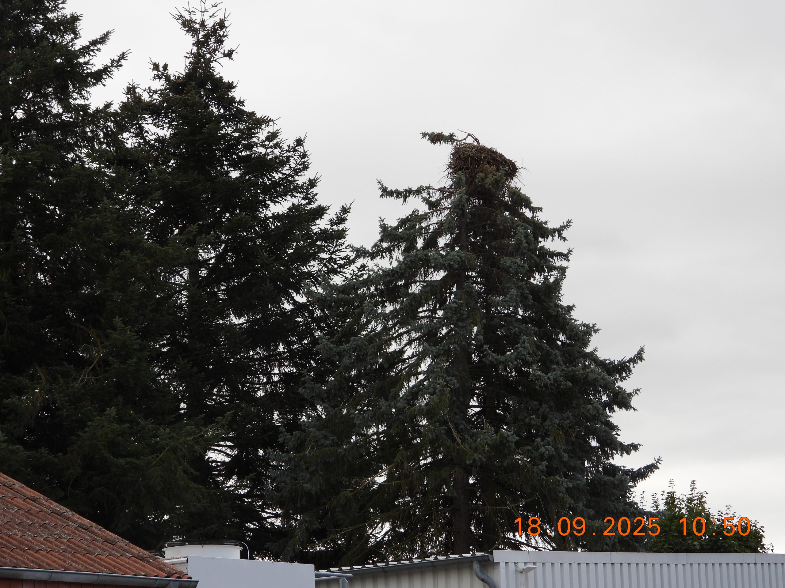 Aktuell brütet dort seit 2024 eine beringte Störchin und ein unberingter Weißstorch. Der Horst droht leider abzustürzen. Im Jahr 2025 hat er sich deutlich zur Seite gesenkt, die 3 Jungstörche waren zum Glück bereits flügge. Das wäre zwar zu verschmerzen, die Gefahr ist aber groß dass die Störche einseitig aufschichten und der Horst dann während der Brutzeit abstürzt.