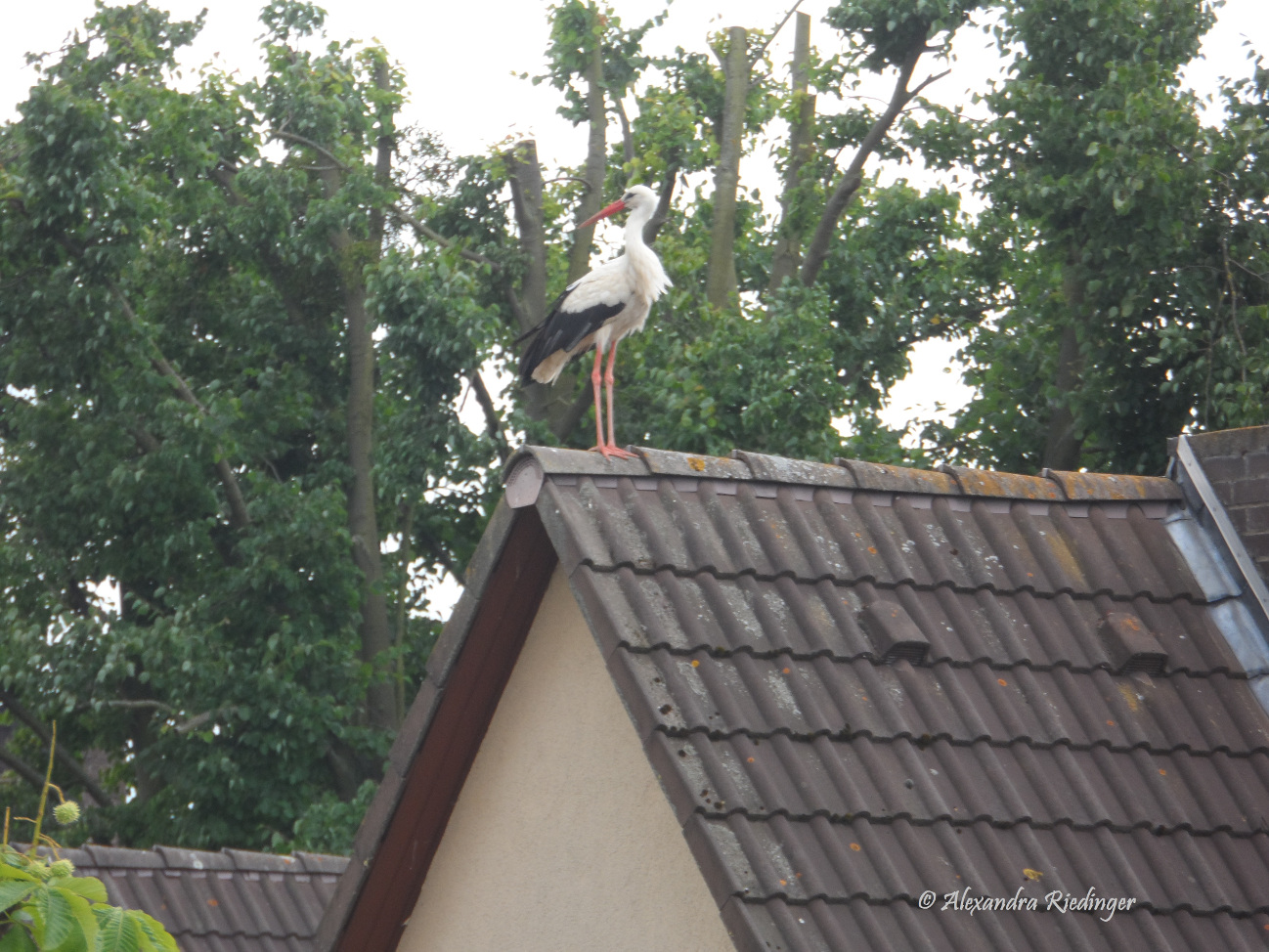 Ende Juli wird dieser Jungstorch von einer Windboe erfasst, stürzt ab und zieht sich dabei einen offenen Beinbruch zu. Die Horstbesitzerin vermutete, dass sie die Dachkante gestreift hat. Wilma überlebt diesen Unfall nicht, stirbt einige Tage später.