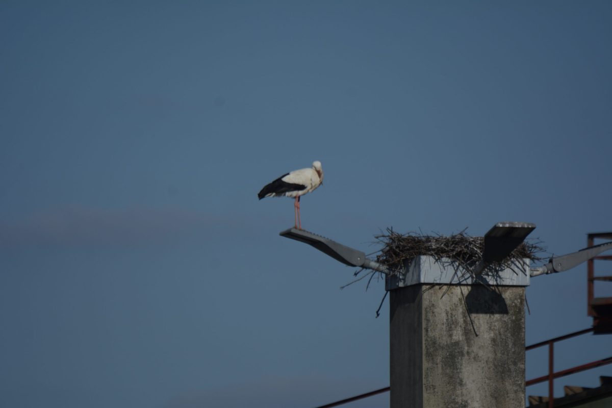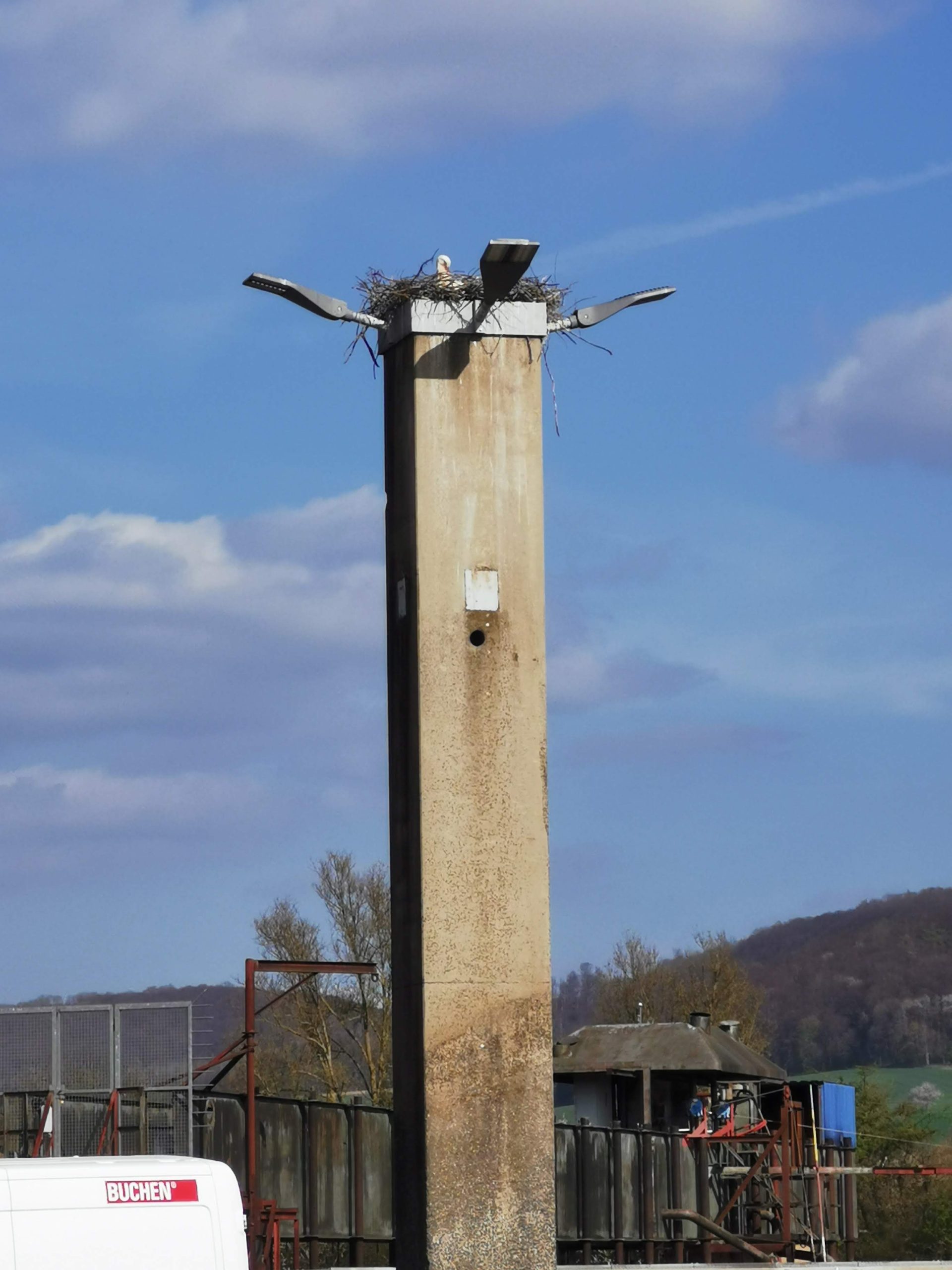 Auf einem Betonpfeiler, ringsherum Leuchten und unter dem Horst parkende Fahrzeuge der Mitarbeiter aus der Zuckerfabrik? Ja, ausgerechnet hier baute ein Storchenpaar einen Horst. Sie sind immer für Überraschungen gut, die Ciconias. Der rauhe Putz lässt selbst einen Marder hinaufklettern, die Höhe ist nicht exponiert. Es gibt ringsherum weitaus bessere Standorte in luftiger Höhe die den Störchen zur Verfügung stehen. Unweit des Parkplatzes sind auf der anderen Straßenseite Pappeln die zu einem großen Teil unbelaubt sind und eine gute Höhe bieten.