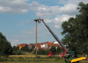 Die Storchenhorste sind leider in den seltensten Fällen mit einer Leiter erreichbar. Wenn hier nicht die Feuerwehr hilft, wird es fast unmöglich Störche zu beringen. Die Kosten für einen Hubsteiger, müssen die Horstbesitzer alleine tragen.